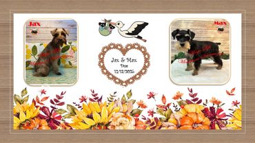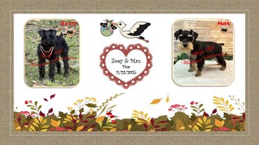 Zoey and Max's litter is due 11/23/2025. We estimate the size of the puppies as adults to be between 12 - 16 lbs. This is Zoey's first litter, but we predict the colors to be variations of black, such as solid black, black & silver, and black & tan. Possibly a few surprises too!